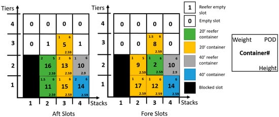 Since the operating costs for shipping companies are partially determined by the port’s fees, it is significant to effectively manage the intricate activities in the port to reduce the vessel’s turnaround time and handling charges []. The effective arrangement of containers on board vessels (i.e., stowage planning) affects the berthing time, the containers’ handling operations, the vessel’s stability during sailing, and the handling operations. Hence, an effective stowage plan is a key to reach higher productivity and ensuring the safety of the vessels [,,].