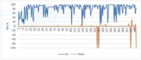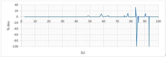 Figure 17 shows the deviations of Figure 16 plotted against the percentage of Space Utilization. The curve shows deviations occurring all in the range over 55% of the space utilization. This yields to the assumption that the larger values of the Space Utilization (SU) are susceptible to higher deviations.