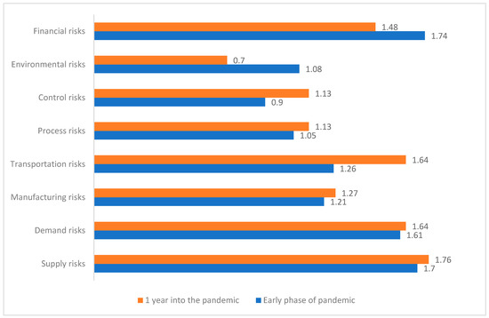 Figure 2 compares the degree to which respondents experienced different types of risk during the early stage of the pandemic with that one year into the pandemic. Scores are on a qualitative scale ranging from 0 for “not experiencing”, 1 for “somewhat experiencing”, 2 for “clearly experiencing”, to 3 for “greatly experiencing”. At a high level, the data show that all types of risks are experienced but to differing degrees. Demand and supply risks, the risks most frequently discussed in the literature, are prominent but so are financial risks, perhaps as a consequence. Manufacturing and transportation risks are also substantial, reinforcing the relevance of exploring beyond demand and supply risks. Perhaps fortunately, control and process risks are experienced at a somewhat lower level. This may imply that managers do feel they have some control and process robustness to cope with the risk scenarios experienced.