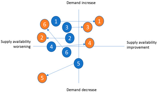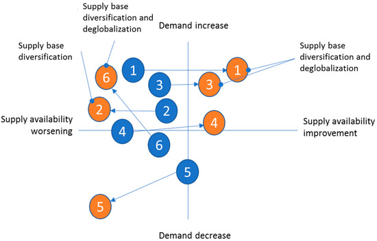 Case company 4 experienced a reduction in demand risks due to demand normalization and supply availability improvement. Case companies 3 and 5 both saw continued high demand risks but for different reasons: case company 3 was experiencing continued growth of demand that the company found challenging to meet with supply, whereas case company 5 faced continued shortfalls of demand and this was placing pressure on supplier relationships and the financial viability of the company and its supply chain partners. Figure 4 maps the changes in demand risk in relation to the changes in supply risks for the six case companies, to advance the conceptual point from Sodhi and Tang [1] that demand and supply risks are involved in the pandemic. The figure adds a dynamic perspective to this notion and demonstrates the rich multitude in change directions experienced.