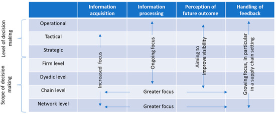 The behavior of supply chain managers in the face of disruptions has been called out as an emerging and promising area [30]. Sitkin and Weingart [31] found a relationship between risk propensity, or the willingness to take risk, risk perception and risk decision making. It may be assumed that in the context of the pandemic, experience with risks increased during the first year of the pandemic and that, as a result, more decision making took place one year into the pandemic. It may be assumed that the decision-making process varies depending upon the type of risks experienced [32]. When it comes to behavioral aspects, the focus has been placed on issues of information sharing to improve supply chain efficiency [33]. Schorsch et al. [27] developed a categorization of information processing in the supply chain, reproduced in Figure 1. They found the largest focus in existing behavioral research to be on information processing, particularly operational information processing, and a lesser focus on perception of future outcomes and the handling of feedback. The least focus in behavioral research was found to be on information acquisition and a much greater focus was found on the firm and dyadic levels than on the chain and network levels. It may be assumed that with a growth of risk propensity during the pandemic, managers are more willing to share information, in particular at the supply chain level, and that their ability to execute changes in the supply chain may improve.