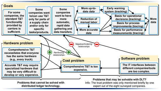 For topics that are closely linked to business administration, i.e., closely linked to the actions of organizations and people, qualitative research based on case studies and expert opinions is particularly well suited. Accordingly, it makes sense that case studies and expert surveys/interviews are often used in research regarding the use of blockchain and DLT in the context of supply chain management. Among the more recent studies in this field are those of [6,7,23,24,25,26,27,28]. The methodology used to analyze the results is quite different depending on the respective study. The authors of ref. [25], for example, used a sensemaking approach with cognitive mapping. The authors of ref. [23] and ref. [24] used a grounded theory approach, ref. [26] used a design science approach, ref. [27] employed the Delphi study method, ref. [28] used an explorative case study research approach, and ref. [6], as well as ref. [7], used a mindfulness framework to evaluate the selected use cases. Our study differs from the existing literature in mainly three ways. First, we placed an explicit focus on T&T in supply chains. The existing studies that we are aware of all adopt a broader perspective (SCM in general) and, therefore, do not explore specific topics, such as T&T, in depth. Secondly, we explicitly decoupled the problem description from the studied technology. This allowed us to take a more holistic viewpoint, whereas the existing literature we are aware of tends to focus directly on problems tailored to blockchain technology. Thirdly, we applied a systems thinking approach, which was particularly appropriate in our case, since T&T in SCs combines a technical system, an information system, as well as an organizational and economic system. The approach of [25] is closest to our approach, as we also used cognitive mapping.
