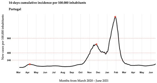 During the emergency situation in Portugal, the military assumed a fundamental role in the response to COVID-19. The choice of the Portuguese Armed Forces as the unit of analysis is justified since the Armed Forces played a significant role in stabilizing the third wave of COVID-19, which placed hospitals across the country under severe pressure after recording more infections and deaths for its population than any other country in the world. At the end of January 2021, the 14-day cumulative incidence was well above the 1000 cases per 100,000 inhabitants in Portugal, reaching a worrying peak of SARS-CoV-2 infections (Figure 1) when compared to the previous peaks (April and November 2020). This situation forced Portugal to invite EU Member States to participate in stabilizing the situation in the country.