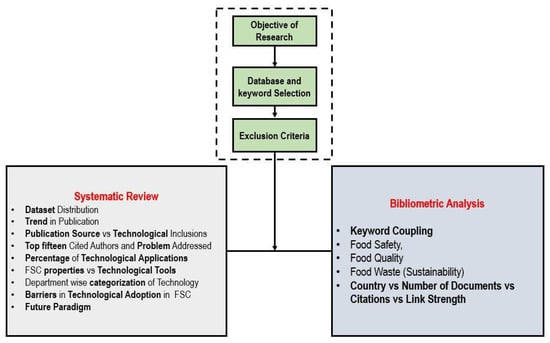 The introduction part of this paper discussed the study’s objective, and is followed by the literature review that portrays the trends, applications, and benefits of different technological tools applied in FSC. The keyword selection and article exclusion/inclusion criteria are described in the methodology section, followed by the results section. The dataset was snowballed with systematic and bibliometric analysis to assess the research trend and gaps. Using the insights accumulated from the overall review, the authors have proposed future research directions and barriers in the technological adoption in FSC at the end of this paper before the conclusion.