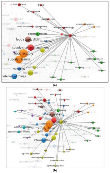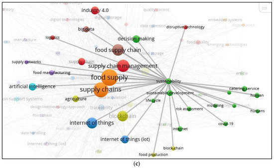 The keyword bibliometric coupling results show the relevance of the research area (keyword) and the intensity of work done based on the distance between them and the size of the node, respectively [43,75]. Inferences can be retrieved by identifying the gaps and future research work. The results from 5a reveal that smart contracts have been deployed in the food industry to maintain food quality. IoT, embedded systems, and Dematel Fuzzy logic algorithms are the primary tools related to food quality maintenance. Whereas IoT, AI, radio frequency identification device (RFID), embedded systems, and big data have all contributed towards maintaining food safety, as shown in Figure 5b. However, IoT and big data are in different clusters with less relevance. This indicates that more research is needed to understand the challenges and drivers of those technological adoptions in FSC from food safety. The same tools are also assisting in sustainability but are seen even farther apart in the nodal burst. The interpretation of the results from Figure 5c keyword burst shows that food waste or sustainable norms of food production and logistics are still in their infancy.