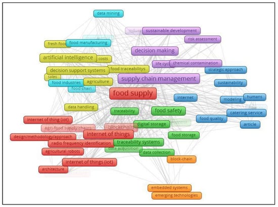 Another set of keyword couplings on the indexed keyword set was conducted to visualize the overall keyword cloud. The minimum number of keyword occurrences were three, and 59 met the threshold out of 741 keywords. The indexed keyword coupling based on text mining has been shown in Figure 6. Five clusters have been identified from the word could. Artificial Intelligence, decision support systems, and big data (data mining) are grouped along with the agricultural systems and food traceability. A separate cluster has been generated for food storage and traceability related to food safety. RFID, IoT, blockchain, and agricultural robots are grouped in a separate cluster. Sustainability and strategic decision making for risk assessment seem to be very close and relevant.