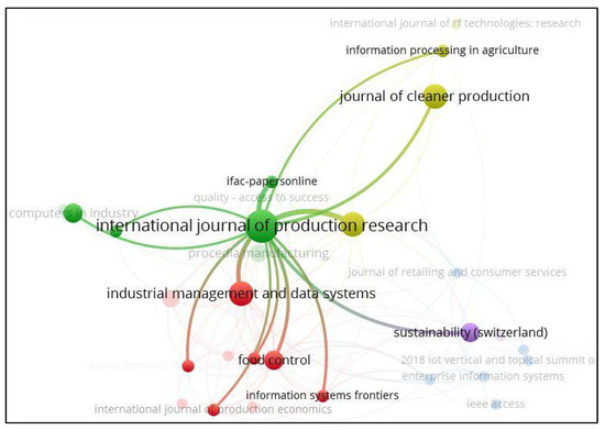 Later, the bibliometric coupling on sources was conducted with one article having a minimum of 10 citations. Out of 90 sources, 29 were the most relevant, which is clearly shown in Figure 7. The larger the nodes, the greater the research volume, and the closer the nodes more relevant the research work. International Journal of Production Research, Journal of Cleaner Production, Sustainability, Industrial Management and Data Systems, Information Systems Frontiers, and Food Control are the journals that have been extensively published in these areas.