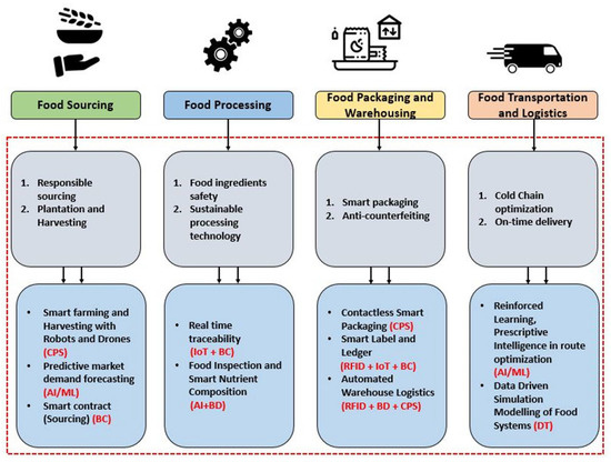 Furthermore, cyber-physical systems have evolved as intelligent mechanical entities that help in the smart production and packaging of products. Therefore, it can be easily linked with IoT, AI, and ML for better performance [47]. One good example of a digital twin application in FSC is portrayed by [48]. They created a digital fruit twin based on mechanistic modelling mimicking the thermal behavior of food products (fruit) across the cold chain, and quantified the enzymatically driven, temperature-dependent biochemical breakdown processes. This improves supply networks by documenting and predicting where temperature-dependent food-quality loss happens in each supply chain due to extended refrigeration times.