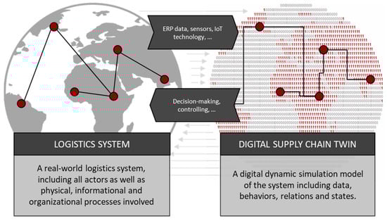In the current academic debate, DT and DSCT do not have a consistent definition [15,16]. The concept is sometimes used in a misleading way [11]. Furthermore, current literature about DT primarily discusses concepts that are asset-focused and associated with digital images of single machines. However, asset-focused twins do not adequately reflect the diverse application fields and implementation possibilities of the whole DSCT concept [17]. Especially in the context of LSCM, with all its complex challenges such as increasing customer requirements in terms of speed and flexibility [18] or responding efficiently to volatile markets [19], the DSCT has to be considered in a very differentiated context as opposed to “classical” research on DT.