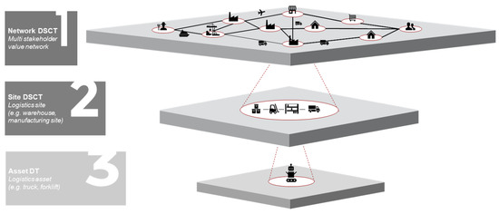 One might find this counterintuitive at first, since “manufacturing twins” seems to be a more accurate description of these cases. However, the authors’ intention is to emphasize the fact that logistics systems on a site level are merely a part of a greater logistics system on the macro level. Speaking of DSCTs on different levels, therefore, underlines the holistic approach of LSCM. As in other comparable terms, the expression “supply chain” in DSCT is used as a synonym for “in the field of LSCM” rather than “applied to supply chains”. The term “supply chain analytics”, for example, describes the use of analytics in the field of LSCM, without being limited to network level applications [38].
