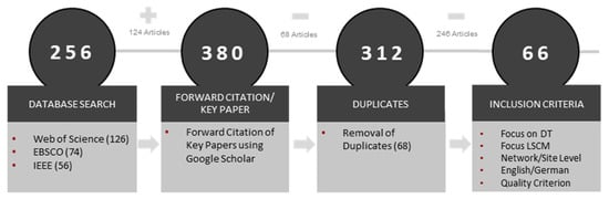 In this step, 246 articles were removed. Mostly, the first inclusion criterion was violated. A great number of articles merely mention the DT concept in their abstract, but have an overall different focus of research. Because some of the articles failed to meet not just one but multiple criteria, further analysis of the literature selection was not conducted. After applying the inclusion criteria, a final synthesis sample of 66 articles remained (see Figure 4).