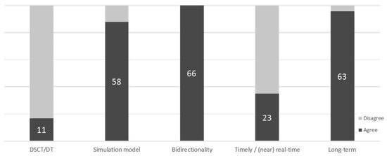 A dynamic simulation model is a model that enables dynamic experimentation, i.e., a model on the basis of which time-sensitive simulation experiments can be performed [36]. This distinguishes the DSCT from other static digital models. Still, it does not exclusively generate benefit by running simulation experiments. The range of value-adding methods used in a DSCT can range from simple means of business intelligence like reporting and monitoring to more advanced analytics tools like network optimization algorithms or scenario analyses though simulation experiments. Likewise, several benefits might arise from DSCT applications, such as agility, robustness, sustainability and efficiency improvements. This definition is deliberately kept general, since a specific definition can only be derived from a specific use case.