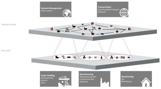 A distinct terminology is proposed to help classify DSCTs along a rough subdivision regarding their scope. A twin at the network level of a logistics system (value network) is defined as a “DSCT of a value network” or “network DSCT” for short. A network DSCT might refer to a multi-stakeholder value network. A DSCT at the site level is referred to as a “DSCT of a logistics site” or “site DSCT” for short. These twins might represent, for example, warehouses or production facilities. Many use cases, which are often referred to as “manufacturing twins” in literature, fall under this category.