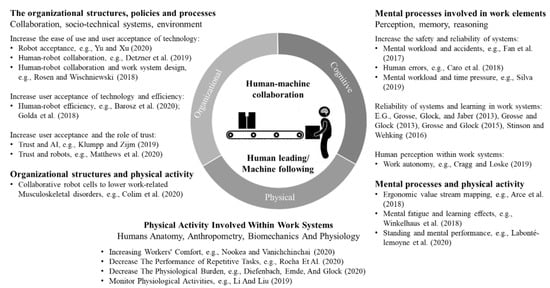 Positioned at the overlap of cognitive and physical factors, research streams investigate physiological factors that influence cognitive factors of the human workforce. Researchers address the overlap of cognitive and physical factors when studying the effects of human fatigue on learning in an explorative experimental analysis—findings show that mental fatigue appears to have a negative influence on learning effects []. A further example for an investigation positioned at the intersection of cognitive and physical factors is a study to determine if using a standing desk would affect the productivity of workers, based on the type of work they perform. The researchers found out that a standing desk had no negative effect on performance or perception, but it did lead to increased brain activity []. Aspiring to merge ergonomics and performance, current research approaches propose the application of ergonomic value stream mapping []. At the interface of organizational and physical factors, research streams investigate the impact of automation on physical activity involved within work systems. Other authors claim that work-related musculoskeletal disorders are one of the leading occupational health problems and develop a physical ergonomics framework at an assembly workstation of a large furniture enterprise and derive requirements for the creation of a collaborative robot cell []. Similar results are presented by a study applying the concept of overall equipment effectiveness, to find out how to model robotized, and manually operated workstations through computer simulation software [].