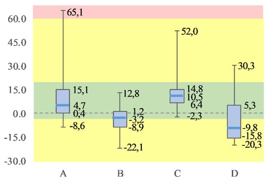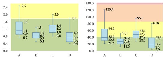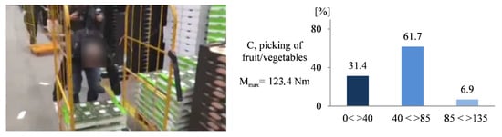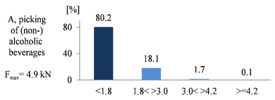 Boundaries are provided for postures and forces as well as moments relevant to the results presented in this paper. The posture data are the basis for estimating compression forces in the lumbar spine. This is done by applying biomechanical models [,]. For the assessment of short-term exposure through manual handling of loads, the Dortmund Guidelines [] apply, which provide age and gender-specific recommendations for lumbar disc pressure. The lumbar spine external moment is calculated based on weight handled, posture, and weight of the individual participant. Insufficient detail, examined activities are described as follows: Activity A, picking of alcoholic and non-alcoholic beverages, potentially incurs health risks mainly due to trunk/back inclination, back torsion, torque in the area of the lumbar spine, and head tilt is present, e.g., when moving packages close to ground level or during wrapping. Further, upper arm inclination (one and occasionally both, compare Table 2) is present and associated with the handling of weights (majorly within the 0–10 kg range). It is notable that this activity implies excessive upper arm inclination far above shoulder level—this may not be obvious from OWAS-classifications alone. Considerable lumbar spine/disc compression forces occur whenever loading of a cart requires bending forward and leaning to its far side while handling loads with arms extended.