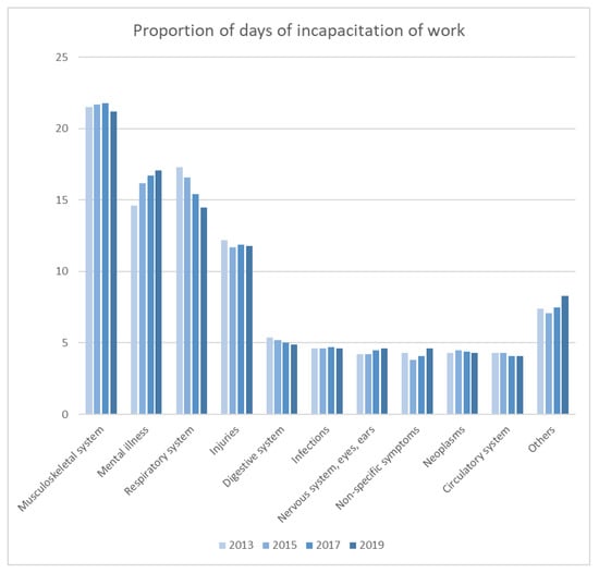 Causes of incapacitation for work (days of absence, Germany) [].