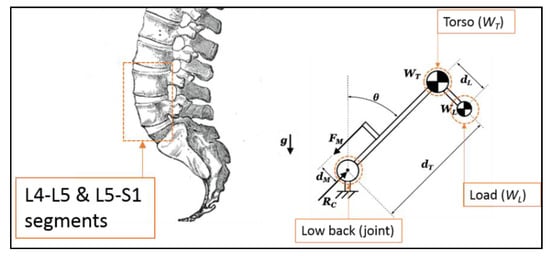 Figure 4 [] presents a 2D-model (sagittal plane, right part of Figure 4) exposing the most critical components of forces exerted on the lumbar spine for cases of weight handling with some trunk inclination (e.g., forward bend) [,].