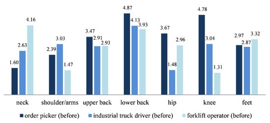 The body of knowledge from trials is distorted towards treatments for low back pain. “Evidence about prevention, particularly primary prevention, is inadequate. Most of the widely promoted interventions to prevent low back pain (…) do not have a firm evidence base” []. The authors list workplace education, no-lift policies, ergonomic furniture, mattresses, back belts, and lifting devices as examples. In this case study, several optimization options for reducing the physiological burden of order pickers were derived from the quantitative findings of the previously described analysis. These measures are, among others, the results of the operational health management program in the analyzed company. Retracing the movements of the order pickers allowed the deviation of three major fields, (1) optimizing the workplace, (2) lower burdens and educating the workforce, as well as (3) improving the work object, meaning the order picking system, as well as the SKUs to pick (see Table 5).