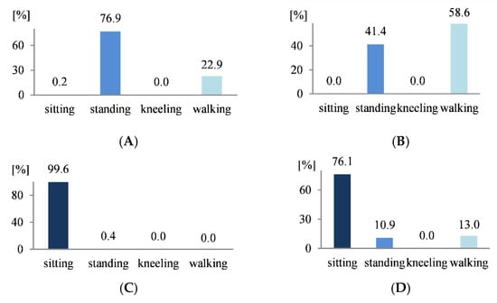Characteristic basic posture patterns for selected activities. (A) picking of (non-) alcoholic beverages; (B) driving an industrial truck controlled by sitting operator; (C) picking of fruit/vegetables; (D) forklift operation.