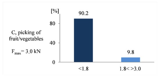 During the measurement for picking of fruit/vegetables (activity C), a total of 184 load weights or 166 load weights per hour were moved. High load weights of up to 20 kg occurred when carrying several heavy packages at once and heavy individual packages such as banana or potato crates. The maximum value of a 3.0 kN disc compression force also occurred when the upper body was leaning forward (see Figure 9). Otherwise, 90.2% of the disc compression forces were quite low (<1.8 kN). During the handling of load weights in flexed back posture, larger intervertebral disk compression forces (about 10% between 1.8 to 3.0 kN, Figure 9) occurred regularly.
