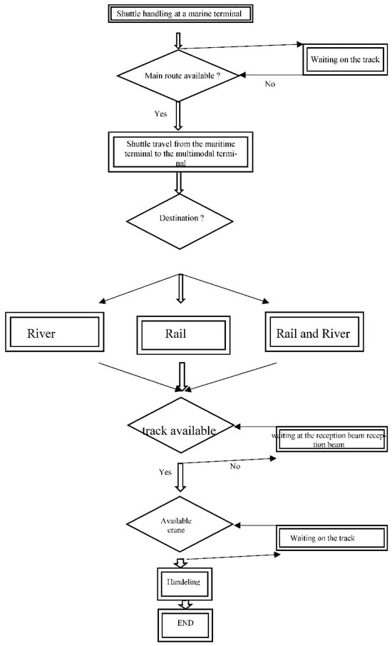 The containers are accepted at a marine terminal and subsequently collected from the storage area during import. To ensure the transfer to the multimodal terminal, a shuttle must be positioned, containers must be loaded, a locomotive must be hitched and the shuttle must be started []. When the shuttle arrives at the multimodal terminal, it will be directed based on its destination: rail platform, river platform or both platforms, as well as track availability (otherwise it must wait at the reception beam). If there isn’t a crane available, the shuttle must wait on the track.