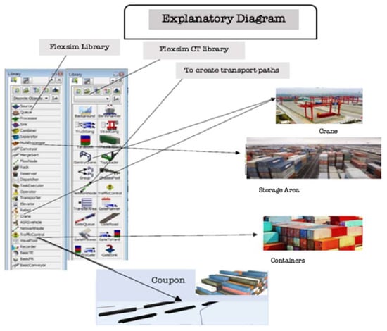 Flow simulation is a frequently used method for creating a model that represents a real-world system. Simulation has historically been used to create or modify manufacturing units, and it is still used to manage production systems. As the logistics chain evolves, new applications for flow modeling emerge []. Simulation allows for the evaluation of a real system’s performance and behavior attributes through a virtual representation. For example, it may be used to estimate the size of the system, increase equipment use and illustrate the potential of additional equipment. Dynamic modeling of business behavior under various degrees of constraints and diverse policies is possible using simulation-based methodologies [].