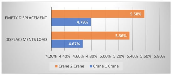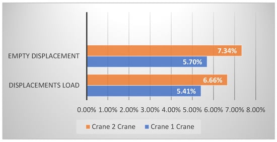The massified mode’s guiding notion is to maintain a constant filling rate for the shuttles. The shuttle does not depart until it has reached 80 percent of its maximum capacity []. This maximizes the rate of resource usage and, in particular, the rate of utilization of the most expensive locomotives. The occupancy rate of the cranes appears to be decreasing. In reality, the occupancy rate ranged between 9 and 11 percent. The multimodal terminal’s “Crane1” is used 9.46 percent of the time, with 4.79 percent empty displacement (without containers) and 4.67 percent loaded displacement. “Crane2” at the Atlantic maritime terminal is operational 10.94 percent of the time; it is empty 5.58 percent of the time and loaded 5.36 percent of the time (Table 3). (Figure 5).