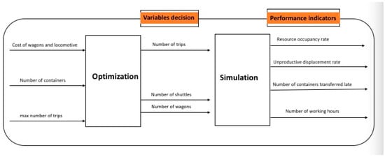 A port’s logistics chain performance is determined by decisions made at the strategic, tactical and operational level []. Our research focuses on evaluating the efficacy of various methods of rail container transfer between the terminals of the Port of Le Havre in order to improve container fluidity while lowering costs and CO2 emissions.