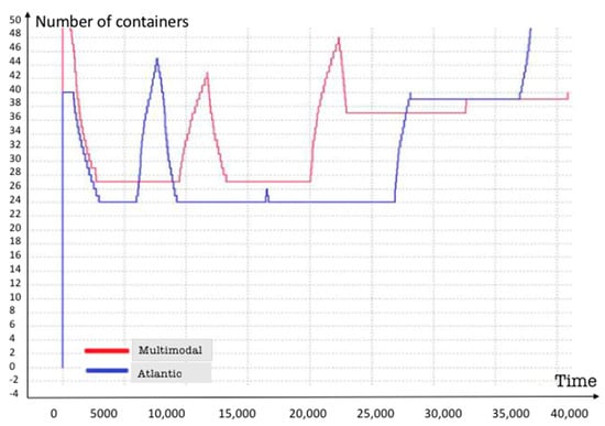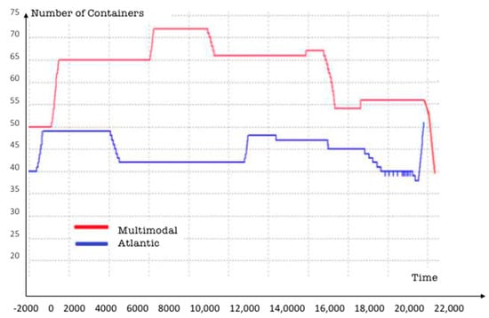 At the end of the simulation, the same number of containers (165) were transferred in order to facilitate transport from the multimodal terminal to the Atlantic terminal and vice versa. The last shuttle arrived on time in planned mode [,]. This aids in ensuring that all containers are moved on time. This way of operation has an advantage in terms of the performance metric “number of containers transferred late.” It ensures that no containers arrive late at the conclusion of the day. In mass mode, there were containers delivered at the end of the day (final shuttle) when they were supposed to be delivered at 3 p.m. The filling rate is to blame for the delay.