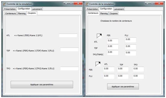 This simulation provides a graphical interface (Figure 11), which is divided into tabs that allows the user to control the simulation and its parameters. The presentation tab includes a brief summary of the simulation’s aims, as well as the various interface functionalities. The next tab is divided into three sub-tabs: container management, planning, and resource sizing and placement. Container management permits users to change the number of containers that must be moved from one terminal to another. Users can define the scenario to be simulated by modifying the timetable under the planning tab. The resource sizing and placement tab configures the size of the shuttles and their starting places [,].