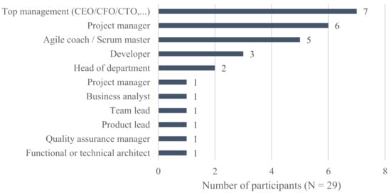 The experts who took part in the Delphi study are all professionals who are presently working on projects in logistics companies in the areas of logistics or agile IT consulting, most of whom have many years of professional experience. Most of the participants were members of top management, project managers, agile coaches and Scrum Masters. Participants also work as department heads, software developers, product leads and business analysts. Since a wide range of experts participated, a number of different perspectives can be included [91]. In Figure 2, the distribution of different roles of the participants of the first round can be seen.