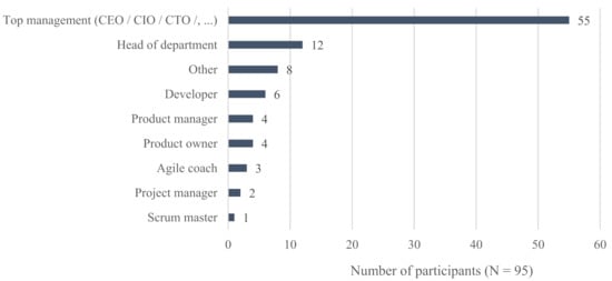 In the survey, mainly members of top management, department heads, product managers and product owners took part. Participants who selected “Other” work as business process managers, heads of agile mastery, account managers, strategy managers or data scientists. Experts performing different roles in the logistics startup participated in the survey. Through these different roles, a multitude of different views could be included [97]. In Figure 3, the breakdown of different roles can be seen.
