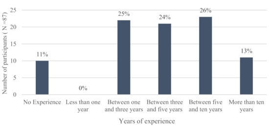 To assess the experience of the participants with the usage of agile methods, the participants were asked how long they have used agile methods. Answers of 87 participants were collected (see Figure 4). More than half of the participants had more than three years of experience with the usage of AMPs.