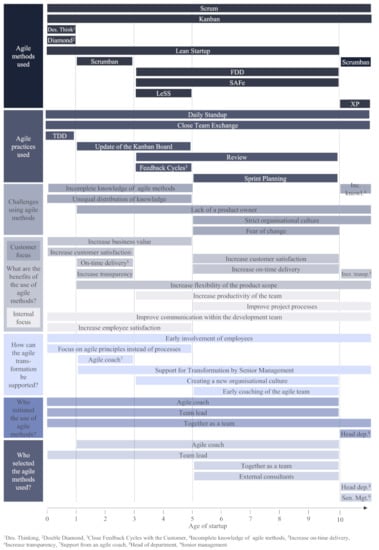 In the analysis of the data, results were broken down into clusters based on the age of the startups or they were evaluated without further clustering. There were some differences in the application of agile methods in startups of different ages. Additionally, to ensure completeness, other possible categories were also looked at to find out whether a different classification could also be interesting. Other categories tested were country of origin of the startups, number of employees, whether the startup is asset-based or asset-light, role of the participant, roles of the initiators and selectors of the agile methods. No significant differences could be found in clustering the data into other categories. To determine the significance, chi-square tests with p = 0.05 were applied [98].