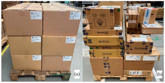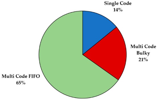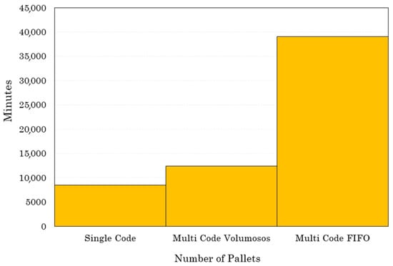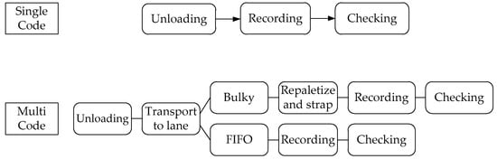 The information in Table 3 shows that the Single Code pallets were delivered to the warehouse reception three times per day, with an interval of approximately 4 h between these deliveries, while the Multi Code pallets were received twice a day, at 10 a.m. and 1 p.m.