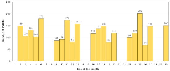 Finally, two charts were developed (Figure 3 and Figure 4) showing the daily trend in the number of pallets received during November 2020, for each pallet type. Although the slight downward trend over the month for the Single Code pallets was not significant, which may have been caused by the fact that on day 26 only 67 pallets were received, the number of Multi Code pallets showed constant growth over the month, which points to the continuous growth of the company’s activity, and consequently the need to make more purchases and, in turn, receive more pallets.