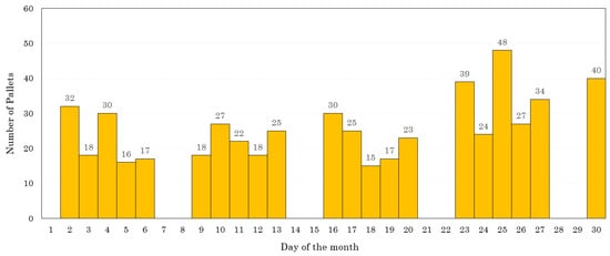 Once the logistics process was well-described and quantified, it was necessary to understand the impact of each task on the company’s day-to-day operations. This mapping alone does not allow any conclusions to be drawn since if, for example, a task that takes 1 min is repeated 300 times in a work shift, it has more impact than a task that takes 30 min but is performed only 5 times during the same period. In this way, all materials unloaded during the month of November 2020 were registered. With these records, the necessary inputs were extracted in order to understand the distribution and frequency of these two types of pallets (Single Code and Multi Code). In addition to recording the quantities per type of pallet, the times at which they were unloaded were also recorded, to observe if there was any pattern (Table 2 and Table 3).