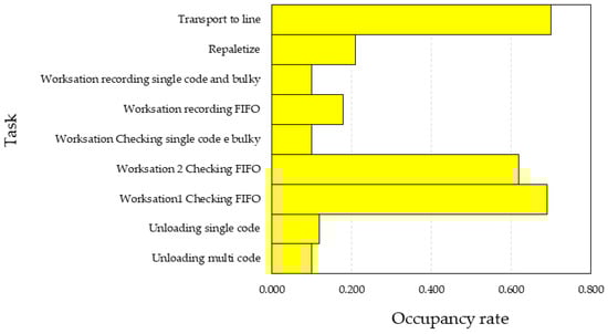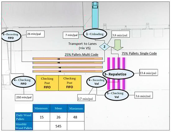 Along with the process mapping, several times studies were performed to characterize the initial state of the process using the Arena® software. These identified bottlenecks and provided data for making a comparison with the future state. After mapping the process and defining all of the tasks, a study of times and working methods was carried out to quantify the impact of each task in the process (Table 1). We measured and monitored the operators in their daily routine, timing all tasks performed by them, thereby collecting information that was later used to identify waste and possible improvements. The unit of measure chosen was the pallet—the time that, on average, a pallet took for each task was measured. With this information, we grouped the tasks by process type and calculated the average Process Time for each process.