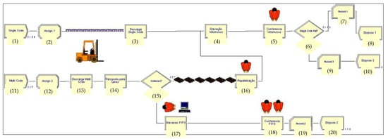 Regarding Multi Code pallets, the flow consists of: (1) unloading—the pallets are unloaded at the docking area; (2) transport to the lanes—after unloading at the dock station, the material is separated by type (Bulky or FIFO) and moved from the dock to its respective area; (3) bulky—the pallets that had been moved to the Bulky area are repalletized, to form Single Code pallets, and strapped with tape so that they can be safely placed in a rack. Then the process is followed with the previously explained recording and checking steps; (4) FIFO—In this area, the pallets are Multi Code. Therefore, after the material is recorded in SAP, these pallets undergo a more thorough and time-consuming checking process, since the codes have to be separated by electric or mechanical means and labeled/checked one by one.