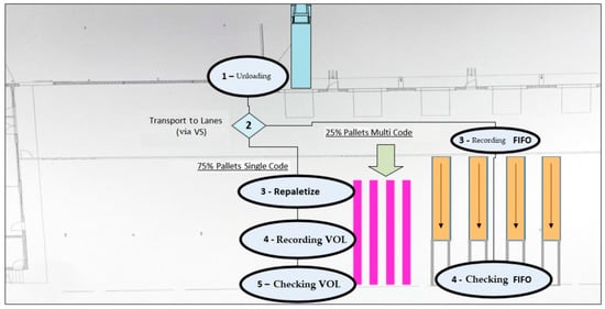 We then carried out a Process Mapping followed by a VSM development [69] in order to represent and identify the various types of wastes. After having observed at a macro level how the reception of material was organized, a process mapping was carried out to understand all the tasks that are performed. Regarding this second step, a visual scheme was first elaborated that included the detail of the process and all associated procedures (Figure 7).