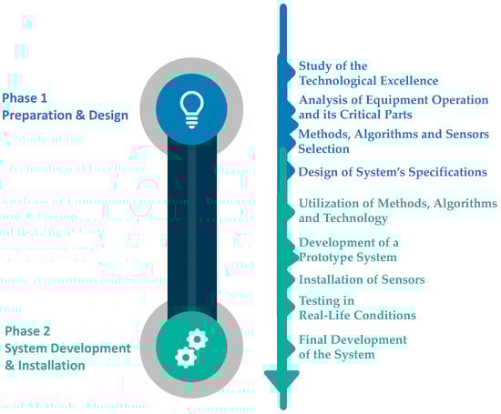 The second phase utilizes the results of the first phase in order to develop and install the designed predictive maintenance system. It includes the utilization of the technology for information system development and the implementation of the selected algorithms (e.g., data analysis algorithms or scheduling algorithms) as well as the methods for spare parts and maintenance services requirement planning. In this phase, the initial development of the advanced predictive system is achieved (prototype). It includes the installation of the sensors as well as the testing of the system in actual operating conditions in order to improve its functionality and make it appliable in real-life cases. Finally, this phase includes the final development of the predictive maintenance system, based on the improvements that are to be decided after the testing. This final version of the system has the potential to become a fully functional tool for effective predictive equipment maintenance.