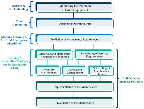 At the same time, the procedures of the reverse supply chain, the operation of the industrial equipment, and the maintenance processes are analyzed, while the critical points of the equipment are identified for the detection of impending failures as well as to find the data necessary to collect. At that point, the procedures are recorded in business process models, and use case scenarios are formulated, ultimately leading to the analysis of the new system’s requirements and its technical and operational specifications. The sensors and smart devices that are evaluated as suitable for data collection and that can be utilized for the system’s implementation are then identified. In addition, advanced machine learning algorithms are developed and can be fed with dynamically changing data in order to improve the predictive maintenance of the machines depending on the history of failures and their operational data. Finally, the appropriate methods for scheduling material supply and scheduling of maintenance workshop visits are formulated for the better management of the service supply chain and the efficient implementation of maintenance.
