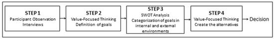 Thus, VFT is developed in order to define and organize the objectives of the people involved in this decision environment. Thus, it can be divided into three steps: identifying objectives; connecting related objectives and classifying them; developing alternatives that best fit these objectives. The third step is the key point of VFT since it directs actions towards the realization of its objectives, rather than just solving a problem.