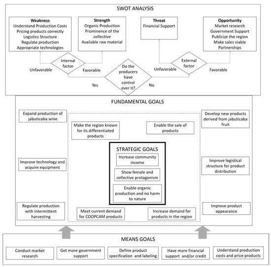 Values-Focused Thinking [35] and SWOT analysis form the methodological basis of this study. Data collection is based on participant observation and interview (Appendix A). In the participant observation phase, one of the authors participated in immersion with the entire production process, from the harvesting of the Jabuticaba fruit to the sale of the products. The producers are asked generative questions, that is, when a question is asked to the participant in order to instigate him to narrate, with a historical–temporal trajectory, the situations that correspond to local characteristics of the order participants [36]. Thus, the generative question for each participant was: We tell, freely, your trajectory—from the beginning to the present day—to organize the production and marketing of jabuticaba—derived products.