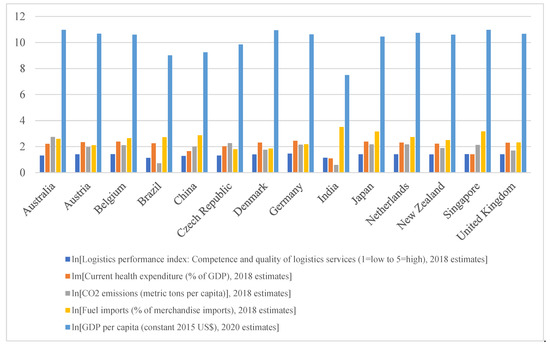 Logistics activities are an integral part of the supply chain process, performing various functions such as customs clearance, trade and transportation infrastructure, international shipments, logistics competence, tracking and tracing consignments, and meeting delivery deadlines [1,2,3]. The green supply chain method is critical for enhancing environmental quality and reducing healthcare costs, assisting economies in moving toward a clean and green agenda [4,5,6]. According to the worldwide dataset, nations that engage in more logistical activities are expected to incur more healthcare costs due to increased logistics-related carbon emissions, fuel imports, and economic activity. For instance, if we closely monitor the trend analysis of the following countries, we see that the Australian economy’s moderate logistics activities (logistics performance index (LPI)) index value is 3.71. This resulted in a tremendous increase in healthcare expenditures (9.155 percent of gross domestic product (GDP)), while Australia released carbon emissions of approximately 15.475 metric tonnes per capita in 2018. Additionally, the country’s fuel imports accounted for 13.312 percent of goods exports (2018 estimates), boosting the economy’s GDP per capita to 58,043.58 US dollars (2020 estimates). The Austrian and Belgian economies have a high LPI index score, 4.08 and 4.13, respectively, emitting more than seven metric tonnes of carbon dioxide per capita and increasing healthcare expenses by more than 10% of their GDP. Belgium’s economy is significantly reliant on fuel imports, accounting for 14.136 percent of item imports, compared to Austria’s economy, which imports fuel at an 8.178 percent rate, helping to boost their economies’ per capita income to around USD 40,381.54 and USD 43,327.35, respectively. Brazil, China, the Czech Republic, and India score reasonably in the LPI while growing their reliance on imported fuels to power economic activity. Japan, the Netherlands, New Zealand, Singapore, and the United Kingdom excel in LPI while increasing healthcare spending to mitigate the harmful impact of carbon emissions caused by importing fuels and fueling economic activity [7]. For convenience, Figure 1 depicts a trend analysis of the parameters mentioned above.