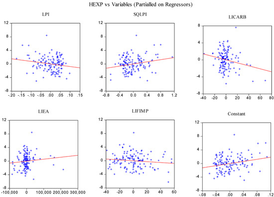 Table 3 shows the correlation matrix and demonstrates that LPI and its square value positively correlate with healthcare expenditures, implying that LPI factors increase healthcare costs because of their unsustainable supply chain process. Logistics-induced carbon emissions and economic growth were positively correlated with healthcare costs. Both factors adversely affected the healthcare sustainability plan that needs to be corrected through the efficient use of green fuel in operations. There is a positive correlation between logistics-induced economic growth and carbon emissions, implying that continued economic growth causes greater carbon emissions in the supply chain process.