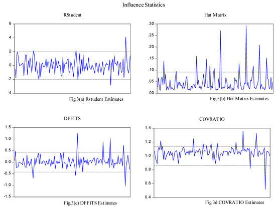 Figure 3 shows the influence statistics that help to assess the presence of possible outliers in the given model. R Student’s statistics show that two outliers exist in the model. The Hat matrix shows eleven outliers, while DFFITS shows seven possible outliers, and COVRATIO shows nine outliers in the given model. Hence, it is evident that the given cross-section is heterogeneous and has a distinct structural transformation across the sample.