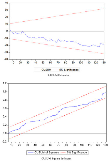 The diagnostic estimates confirmed that the model is free from autocorrelation and heteroskedasticity issues. Further, the Ramsey RESET test confirmed that the model is functionally stable over time. Figure 4 shows the CUSUM and CUSUM square statistics and confirms that the model estimates are significant at a 5% level of confidence, and the model is empirically sound.
