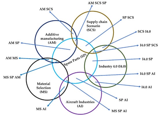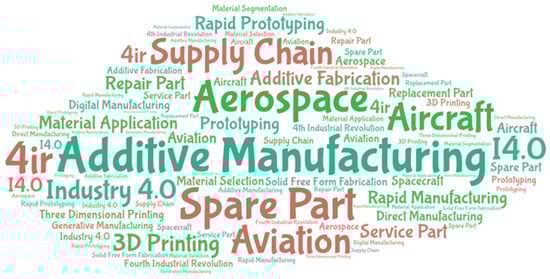 Search strings have been identified via an unstructured literature review. The main aim of this review lies in exploring the supply chain of aerospace spare parts from AM and I4.0 perspectives. Boolean operators combined with synonyms of additive manufacturing, spare parts, aerospace industry, supply chain, industry 4.0, material selection, etc., have been used to form the word string for searching. The strings for each domain are shown in Table 3, and a relevant word-cloud is illustrated in Figure 3.