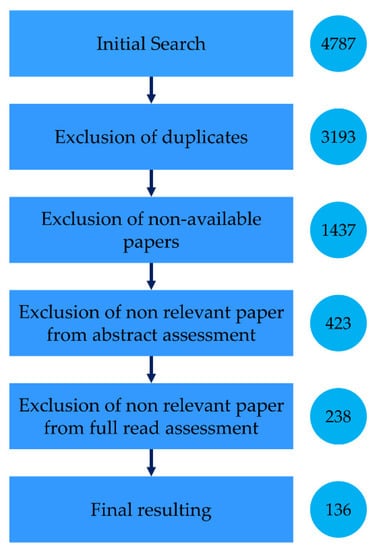 The resulting articles achieved from the search process are either excluded or included for further assessment [33]. The exclusion or inclusion procedure has been divided into subsequent stages with specific criteria. Firstly, the 4789 papers have been identified via the combined search strings and duplicate results have been removed. Next, the abstracts of the papers have been studied and non-relevant papers were excluded. After that, a full-read assessment was performed, and non-relevant articles were removed, resulting in about 238 articles. Finally, 136 articles qualified for the content analysis in the systematic literature review. Therefore, articles that had been identified to be related to the research of core subject areas. The inclusion and exclusion procedure have been illustrated in Figure 4.